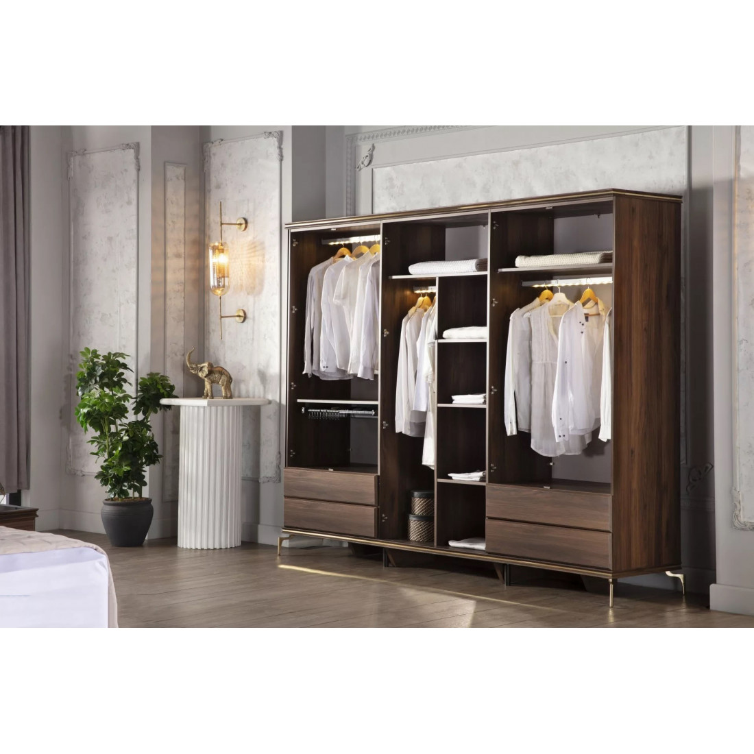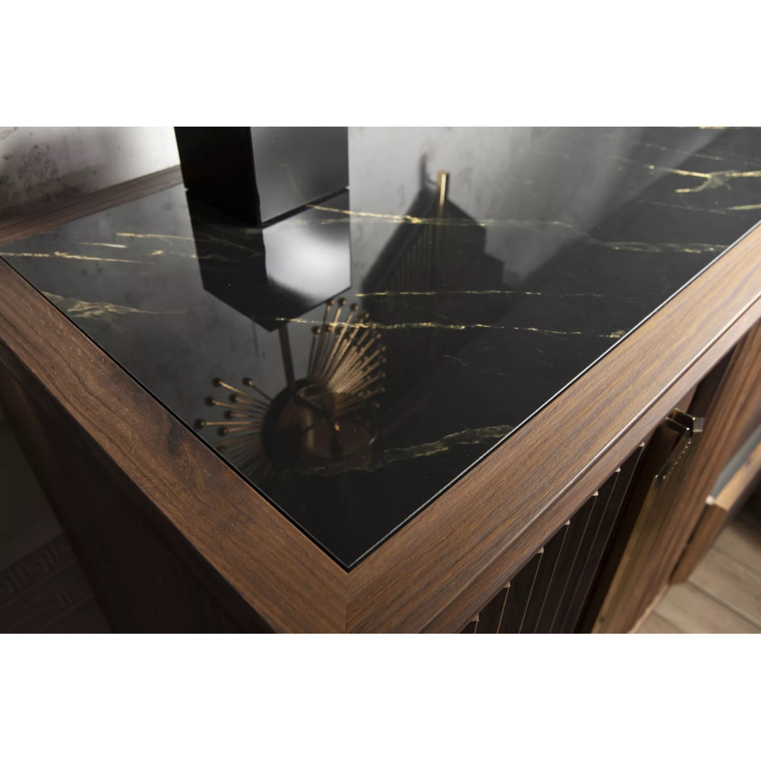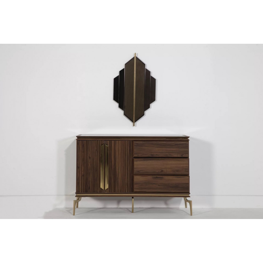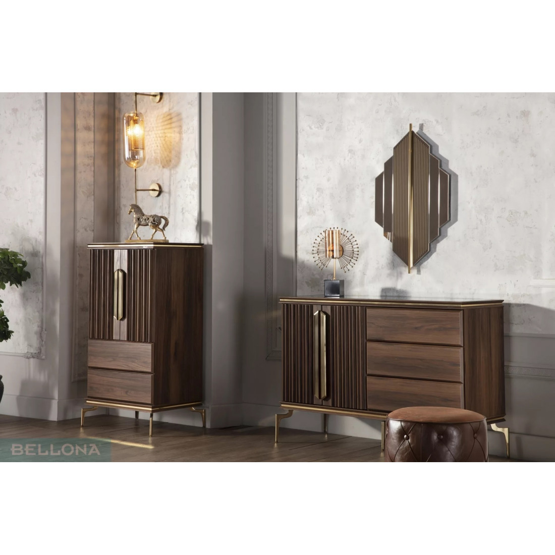 В цветовой конфигурации спальни "Montego" были предпочтительны цвета из черного мрамора с темным орехом. Специально разработанные для коллекции металлические ручки и ножки выполнены в ярко-золотом цвете, чтобы соответствовать стилю. Благодаря применению профиля в треугольной структуре, расположенной по всей системе, было получено визуальное богатство.