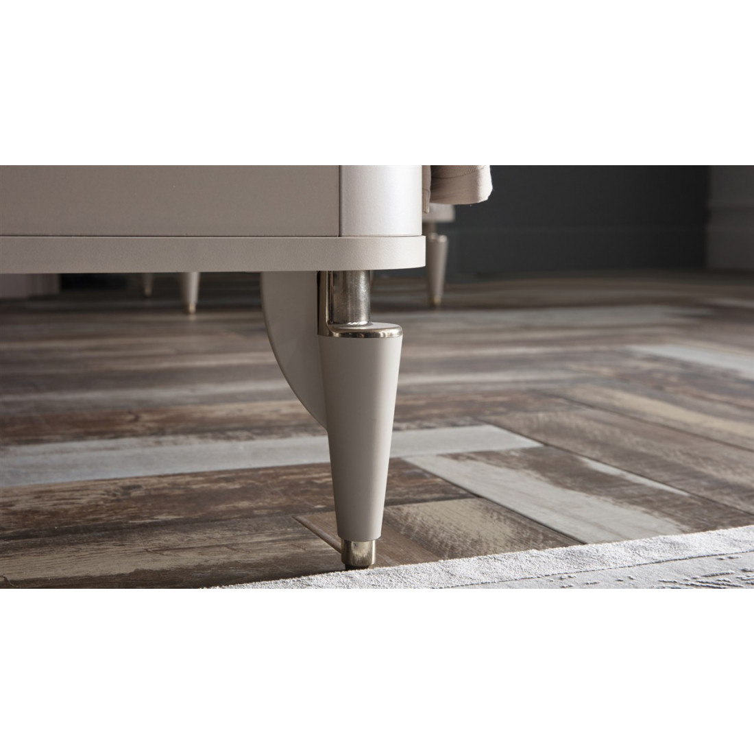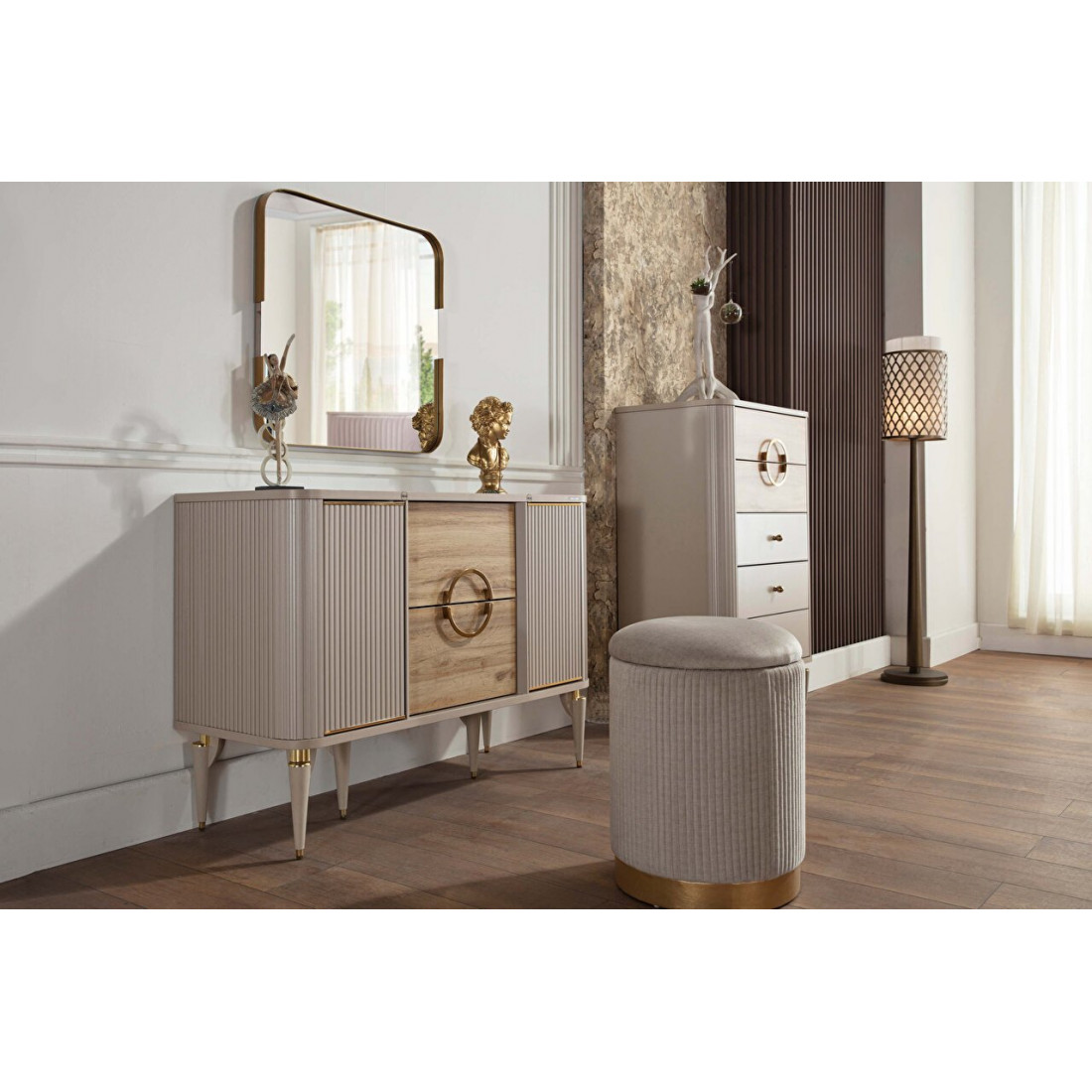 Туалетный столик Санвито SANV-23 один из элементов турецкой коллекции SANVITO. Прекрасное дополнение интерьера спальни, гостиной, залы. Столик обладает сравнительно небольшими размерами 1,170 мм x 470 мм x 830 мм. Может использоваться как дамский столик или как комод. Имеет два больших вместительных выдвижных ящика по центру, и полки для хранения за дверцами фасадов. Кремовый оттенок фасадов, наряду с рифленой поверхностью комбинируется с древесной фактурой ящичков. Оригинальный дизайн и теплые, нежные тона в сочетании с функциональностью столика-комода Санвито SANV-23 делают его изящным и привлекательным.